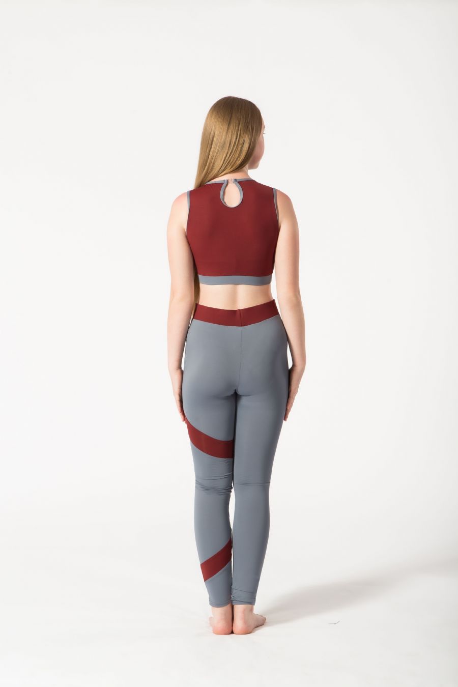 Our ULG17 leggings shown in elephant grey and burgundy meryl.