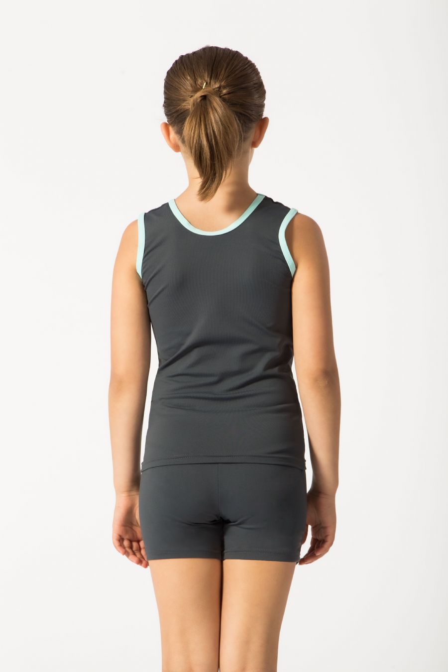 Our ULT01 long length vest top shown in charcoal with aqua braiding.